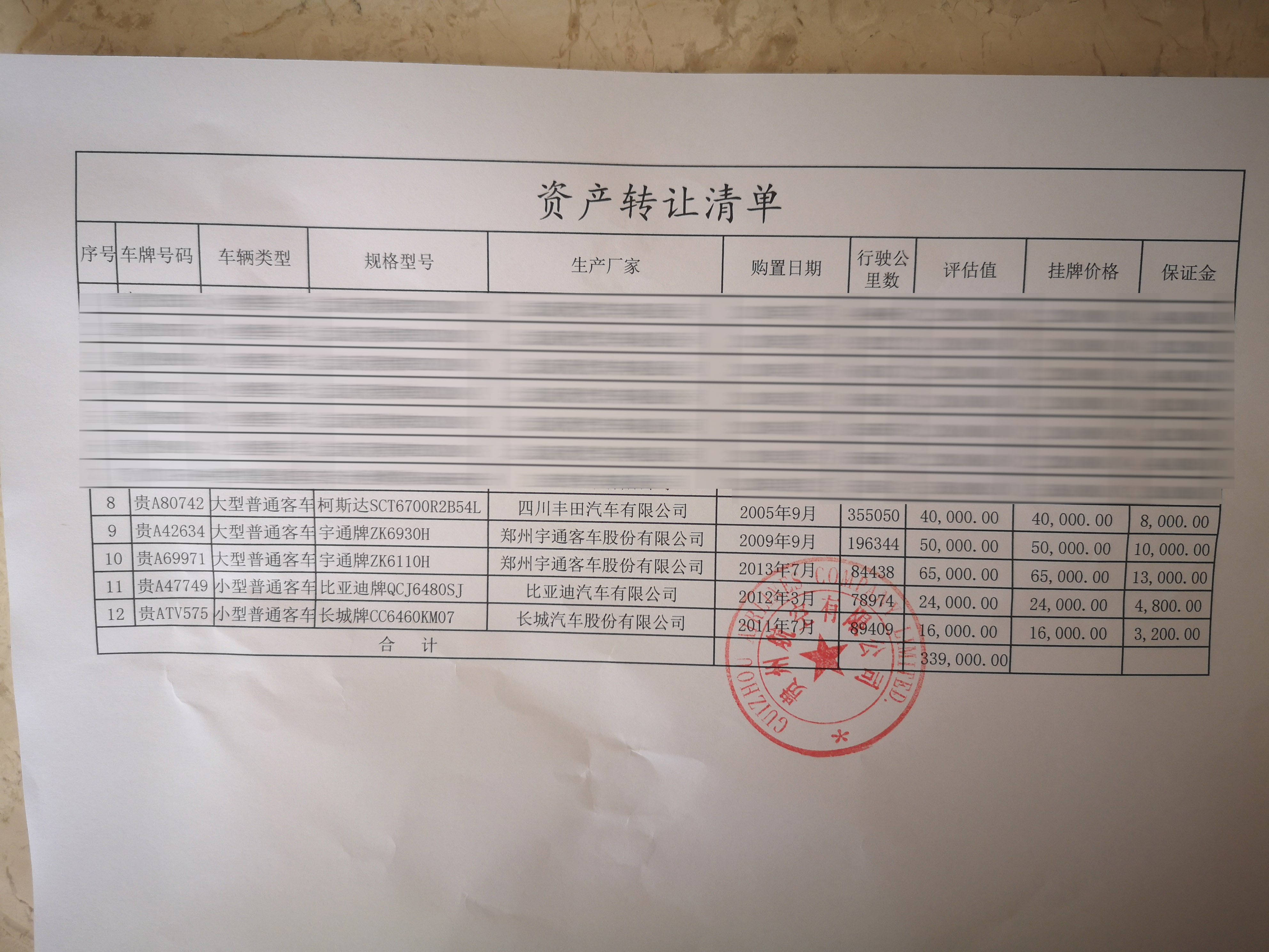| 重要信息披露 | 1、意向受讓方須自行了解本次轉(zhuǎn)讓標(biāo)的的全部現(xiàn)狀及瑕疵,本次轉(zhuǎn)讓標(biāo)的以現(xiàn)狀轉(zhuǎn)讓; 2、本次轉(zhuǎn)讓車輛共5臺(tái),可單輛受讓,也可多輛受讓; 3、本次轉(zhuǎn)讓的所有車輛由轉(zhuǎn)讓方協(xié)助受讓方辦理過(guò)戶手續(xù),過(guò)戶產(chǎn)生的所有費(fèi)用由受讓方承擔(dān); 4、本次轉(zhuǎn)讓的5臺(tái)車輛均無(wú)違章情況并已全部年審; 5、本次車輛有關(guān)信息詳見(jiàn)《資產(chǎn)評(píng)估清單》。 | |||||||||||||