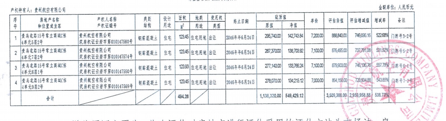 資產(chǎn)公告信息 | 資產(chǎn)描述 | 本次標的為貴州航空有限公司持有的貴州省貴陽市貴烏北路15號常立商城四套住宅: 貴州省貴陽市貴烏北路15號常立商城4單元5層2號,建筑面積123.45(㎡),總價888840(元) 貴州省貴陽市貴烏北路15號常立商城4單元7層2號,建筑面積123.45(㎡),總價876495(元); 貴州省貴陽市貴烏北路15號常立商城4單元8層1號,建筑面積123.93(㎡),總價879903(元); 貴州省貴陽市貴烏北路15號常立商城4單元9層2號,建筑面積123.45(㎡),總價864150(元)。 | |||||