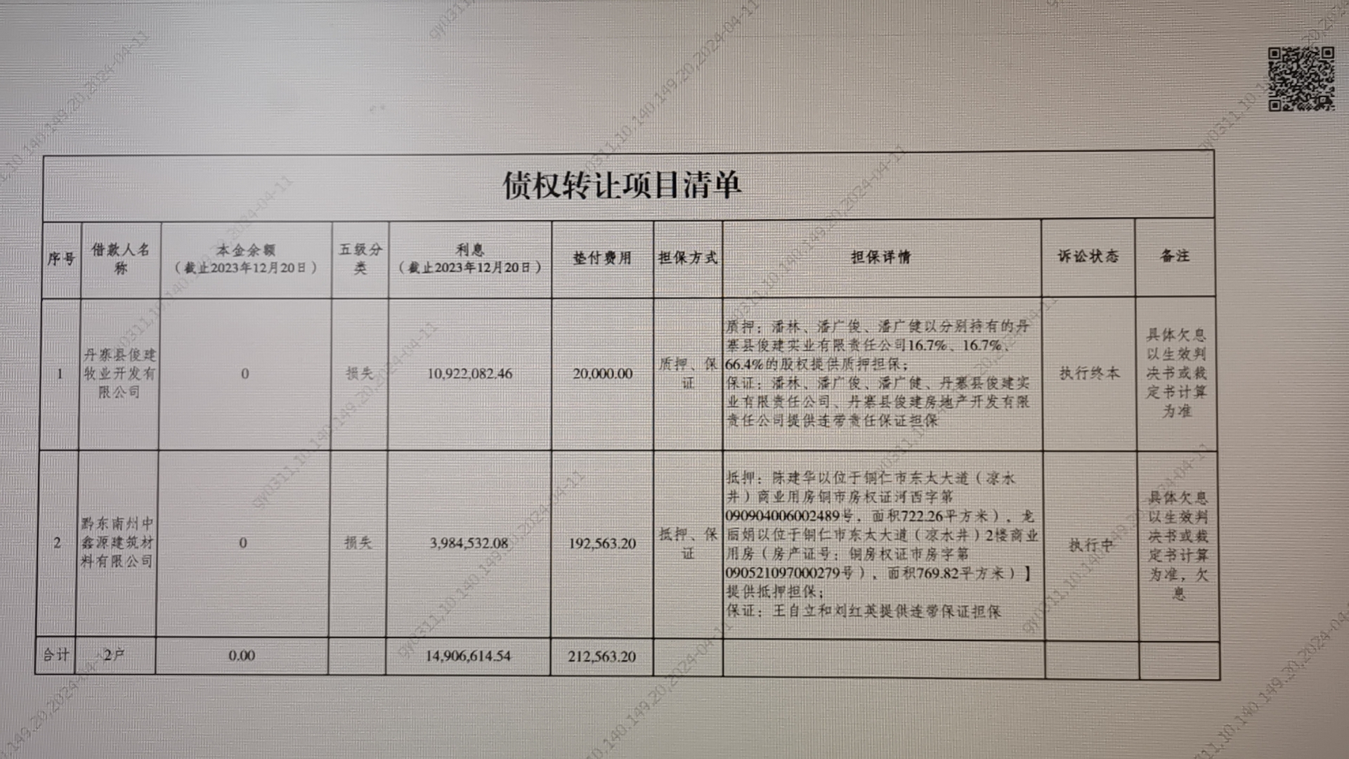 丹寨縣俊建牧業(yè)開發(fā)有限公司、黔東南中鑫源建筑材料有限公司2戶不良貸款債權(quán)及相關(guān)附屬權(quán)益整體轉(zhuǎn)讓