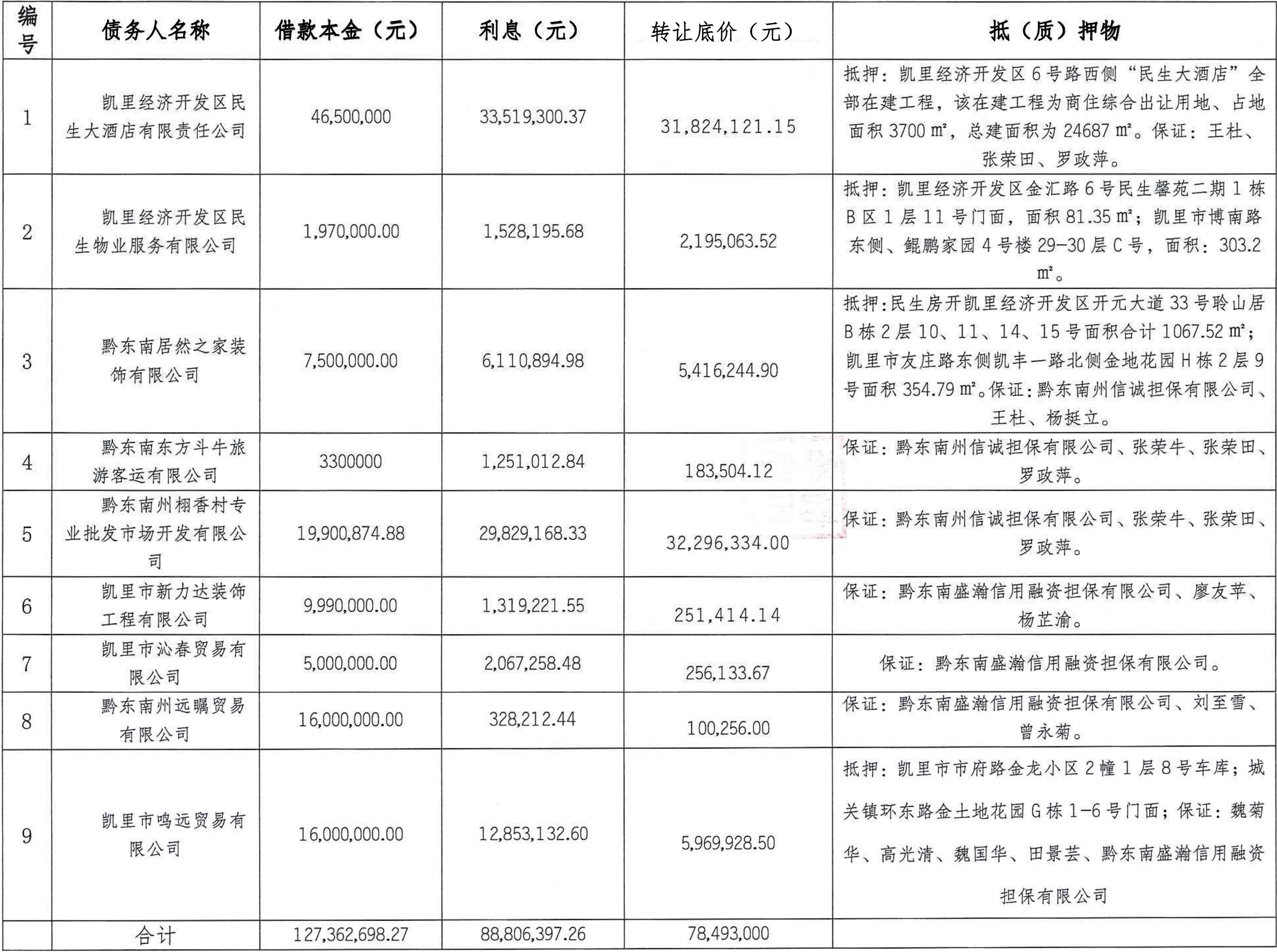 凱里經(jīng)濟開發(fā)區(qū)民生大酒店有限責(zé)任公司等 9 戶債權(quán)資產(chǎn)包整體轉(zhuǎn)讓